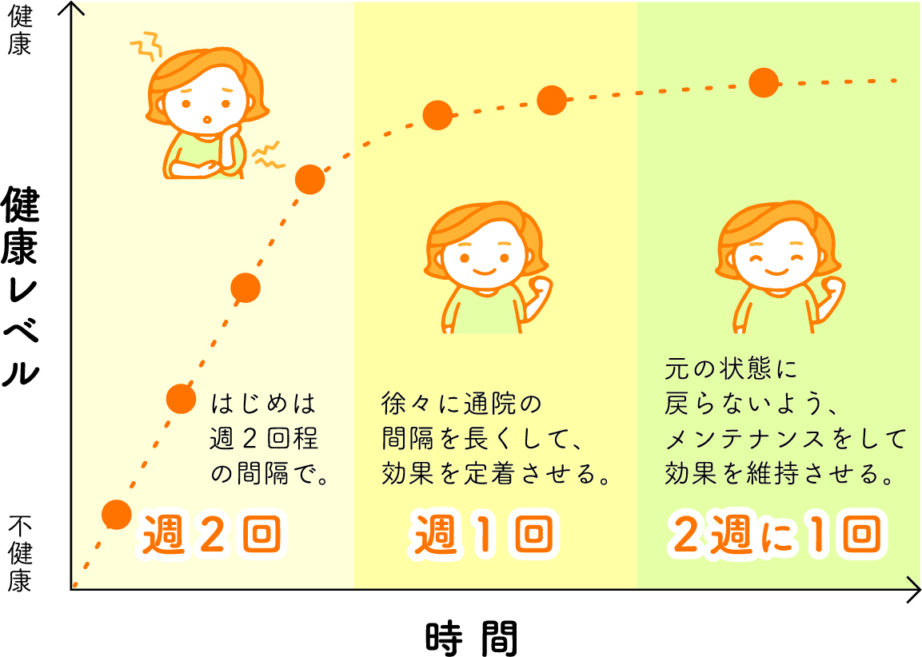 A. 症状や体質、目標によって異なりますが、慢性的な症状の場合、最初の2週間は週2回、その後は週1回をお勧めすることが多いです。